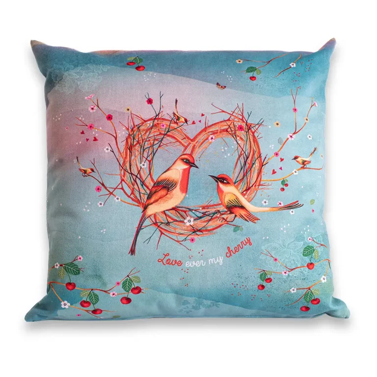 Laissez la tendresse s’inviter dans votre intérieur avec le coussin LOVEVER MY CHERRY, un concentré de douceur illustrée. Sur sa housse en velours imprimé, deux rouges-gorges s’aiment tendrement dans un nid en forme de cœur, blotti sous un cerisier en fleurs. Papillons, cerises, dentelles et un ciel aux teintes roses poudrées et turquoise irisées enveloppent la scène d’un souffle onirique.